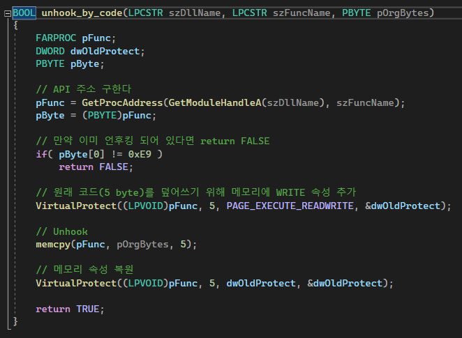 API 후킹할 땐 hook_by_code() 함수로, 해제할 땐 unhook_by_code() 함수로 하는 게지.