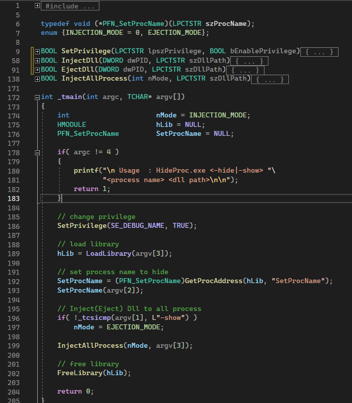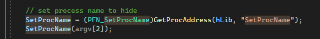 그리고 외부로 export 되는 함수 SetProcName( )을 이용한다. 이 하무는 은폐하고 싶은 타깃 프로세스의 이름을 g_szProcName 버퍼에 저장한다. tcscpy 보이지?
