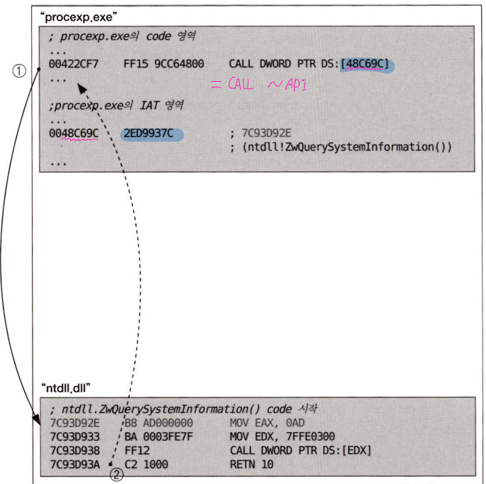 procexp.exe가 우리의 타깃 프로세스이다. 이 프로세스는 IAT 영역에 ntdll.ZwQuerySystemInformation( ) API를 호출하려고 한다