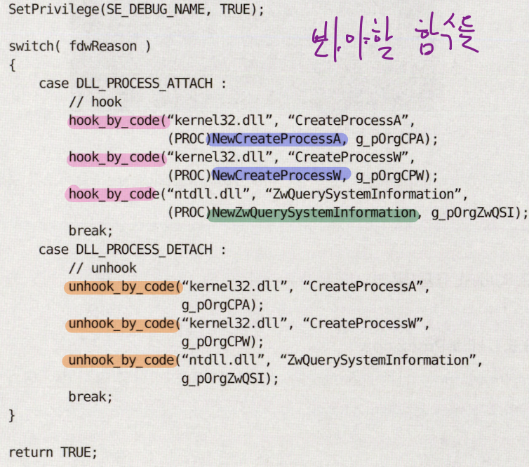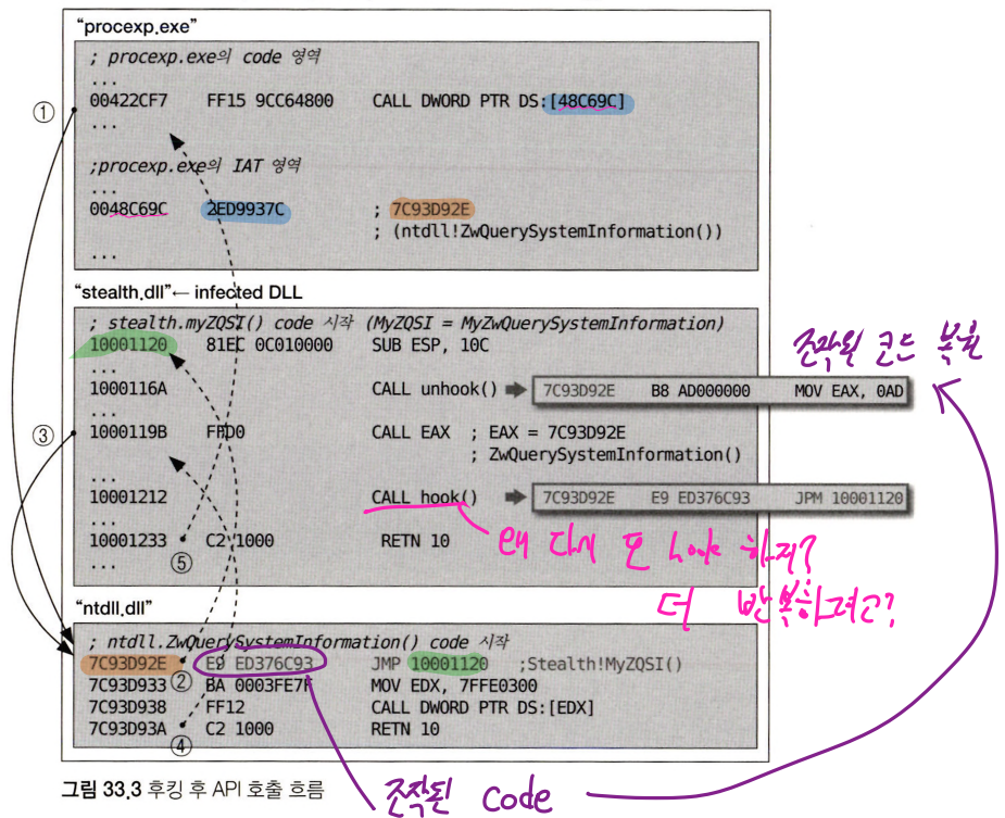 - stealth로 돌아왔으면 다시 원래 API에 후킹을 걸어둔다. 앞으로 다시 쓸 수 있도록?