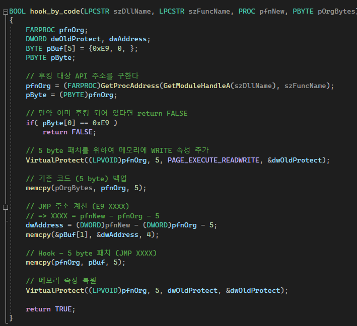 핵심은 원본 API 코드 시작주소의 첫 5바이트를 JMP XXXXXXXX(injected dll 주소)로 가는 것이다.