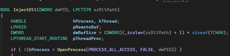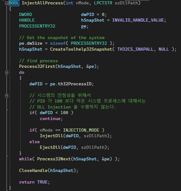 dll을 inject 하는 InjectDll은 여타 본 것들과 비슷하다. InjectAllProcess를 보자.