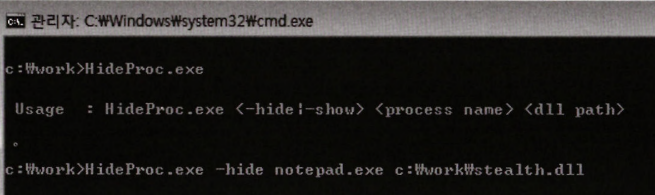 인젝터 : HideProc.exe -> 타깃 외에 실행중인 모든 프로세스에 Stealth.dll 인젝션