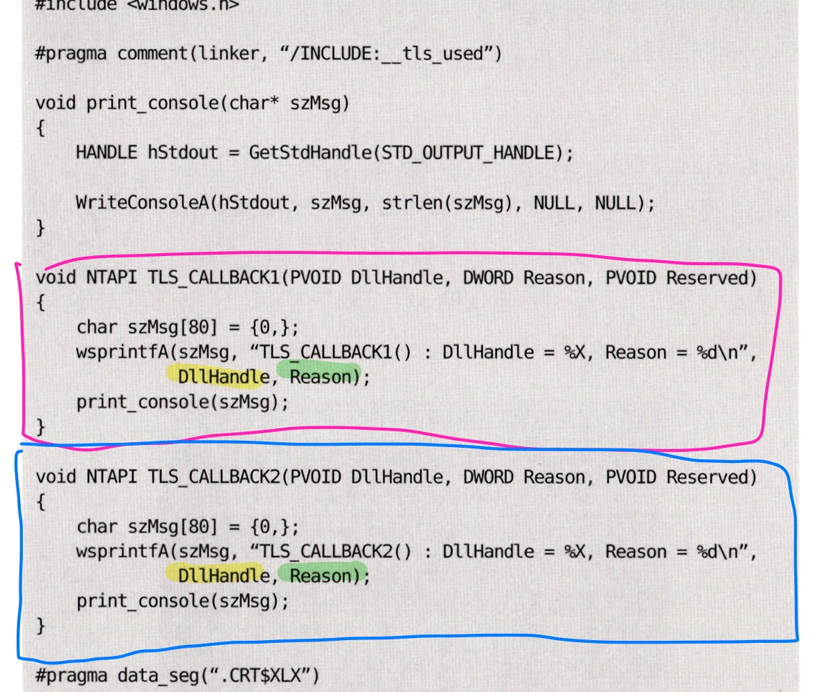 이 TLS 콜백은 스레드의 생성, 종료 총 2번 동안 호출된다.