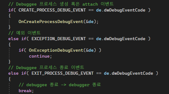 아까 디버그 이벤트가 9개가 있다고 했지. 암튼 디버기에서 이벤트가 발생하면 저 구조체에 첫번째 멤버인 dwDebugEventCode가 적절하게 세팅된다. 그리고 밑에 있는 유니온 멤버도 해당 이벤트로 세팅된다.