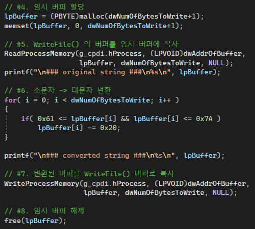 쓰기버퍼 주소부터 버퍼의 크기만큼의 공간을 디버거를 위한 메모리 공간으로 할당해준다. 그리고 소문자를 모두 대문자로 변환해준다.