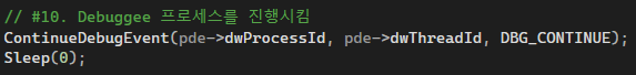 Debug loop 가장 마지막에 있는 이 api는 다시 디버기의 실행을 재개하는 함수다.