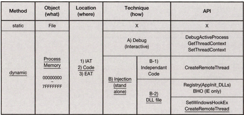 이 그림은 api 후킹의 모든 기술적 범주를 다룬 테크뱁이다.
