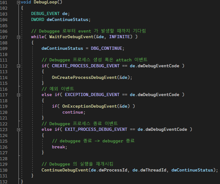 중요한 건 attatch가 되면 디버깅이 시작되고 DebugLoop( )함수로 들어가서 타깃에서 오는 디버그 이벤트를 처리한다는 것이지.