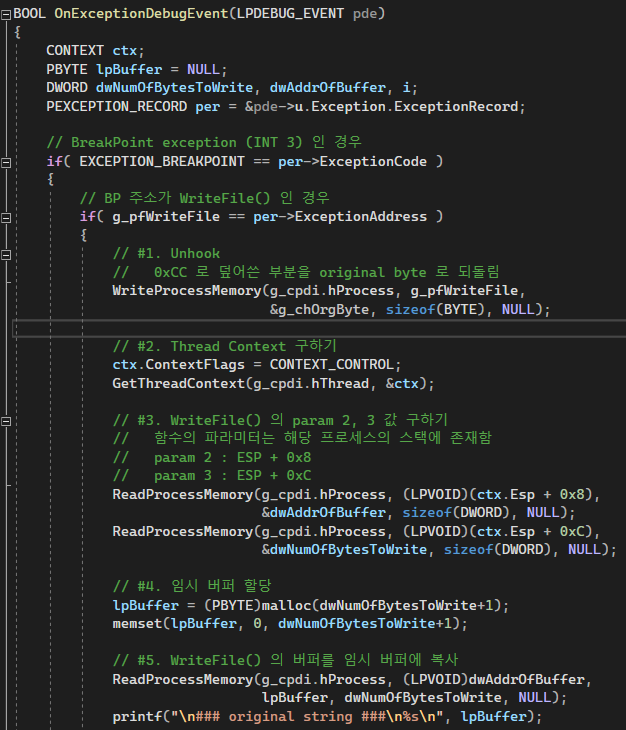 ReadProcessMemory( )로 WriteFile( ) 첫 바이트를 읽어내서 g_chOrgByte 변수에 보존해둔다.