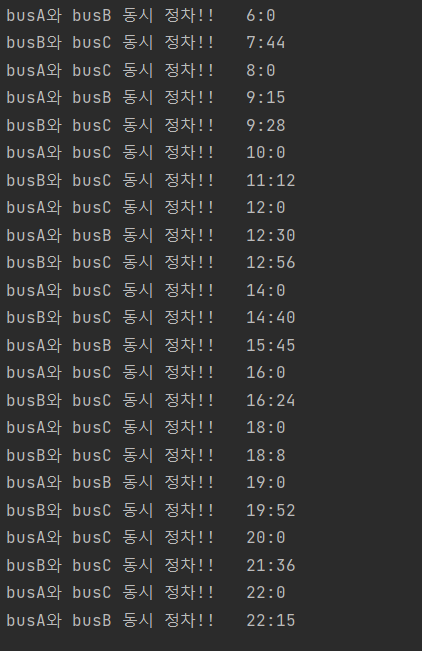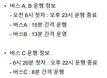 집 앞 버스 정류장에서 학교까지 가는 버스 A, B, C 의 운행정보가 다음과 같을 때, 2대 이상의 버스가 정차하는 시간대를 출력해보자