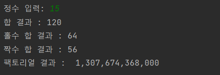 addsum, oddsum, evensum, factorial = 0, 0 ,0, 1