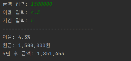 print('{}년 후 금액: {}원'.format(term, target_money_formated))