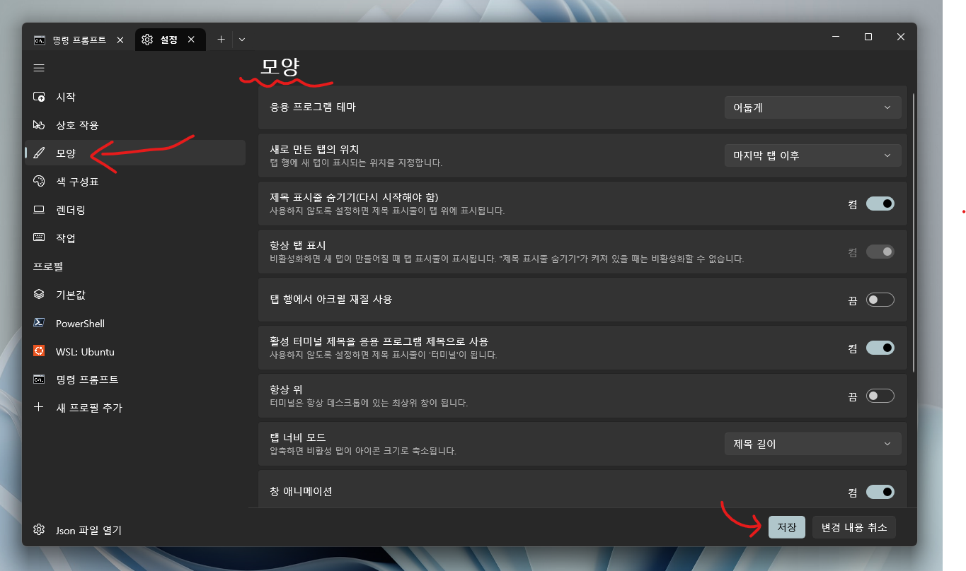 [설정] 탭 좌측에서 [모양]을 누르고, 설정값들을 하나하나 눌러보면서 마음에 드는 설정을 골라줍니다. 설정을 바꾸고 나면 꼭 [저장]을 눌러야 적용되는 점을 참고하세요!