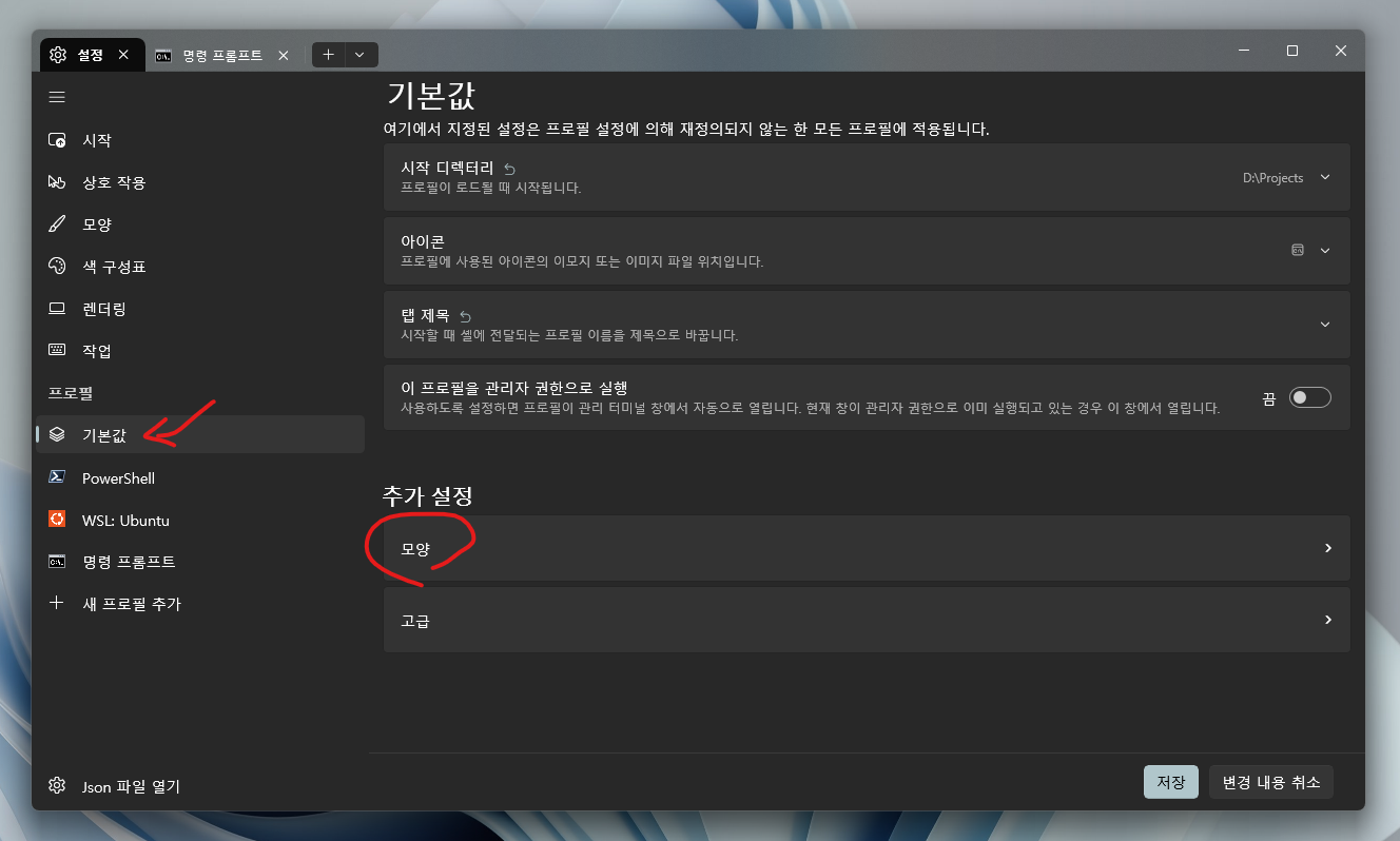 [설정] 탭 좌측에서 [기본값]을 찾아 누른 다음에 [모양] 메뉴를 찾아 들어갑니다. 이제부터가 진짜 시작입니다.