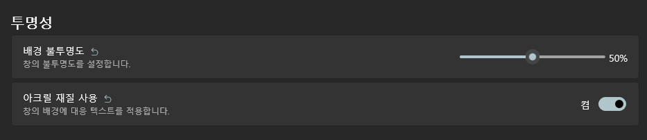 특히 [투명성] > [배경 불투명도], [아크릴 재질 사용]을 조절해주면...
