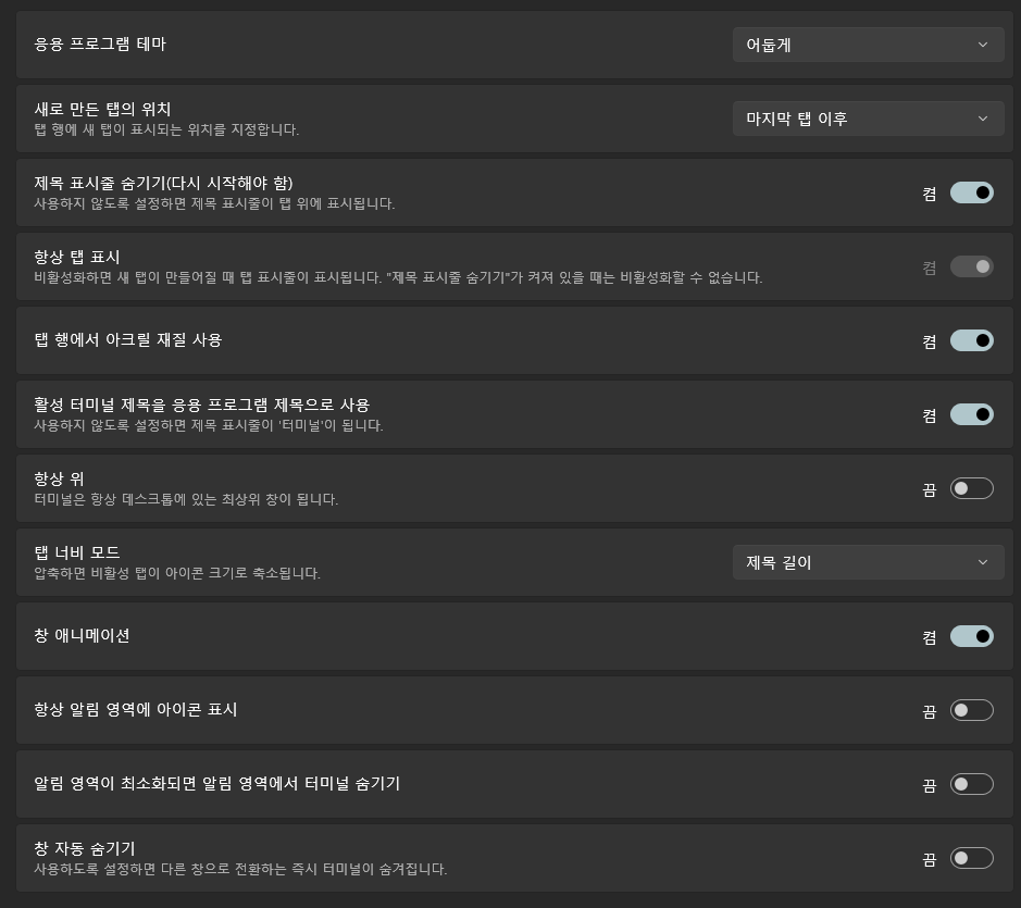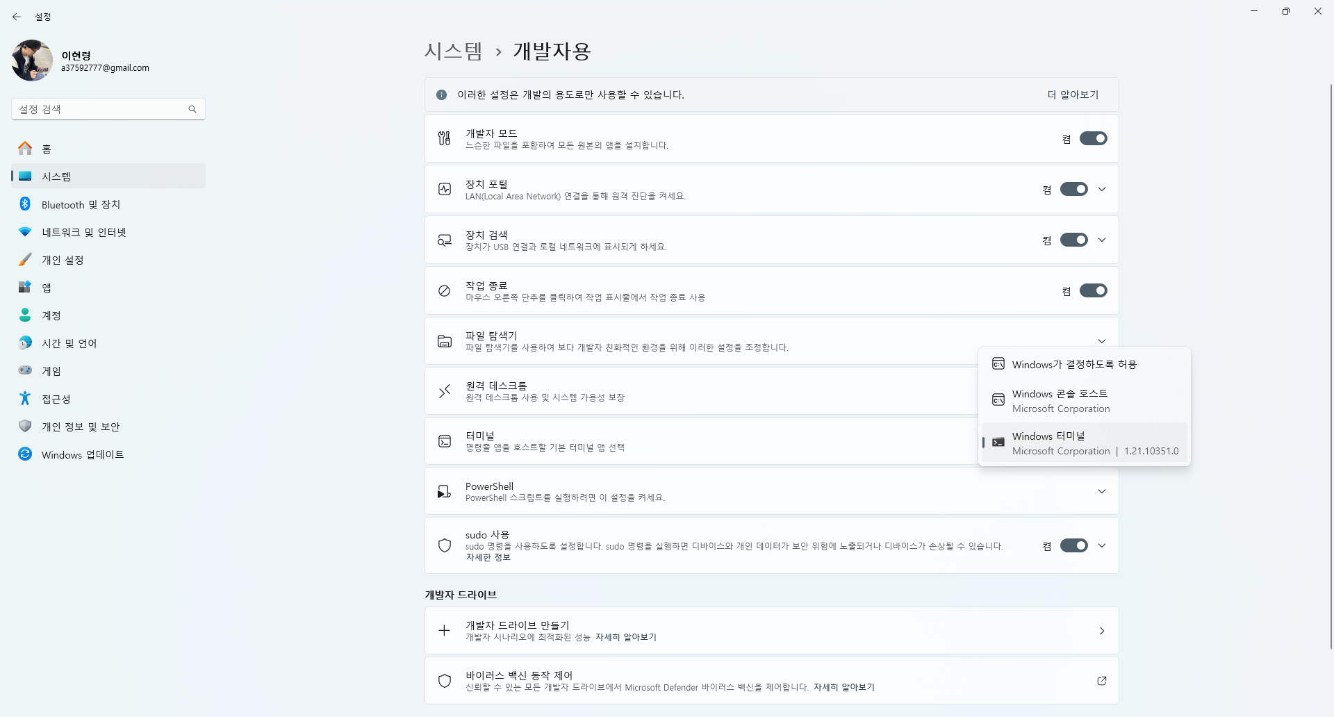 설치가 완료된 뒤에, 윈도우의 [설정] > [시스템] > [개발자]에 들어가면 [터미널] 설정에 Windows 터미널이라는 이름의 옵션이 추가됩니다. 이걸 선택해주면, 앞으로 cmd, PowerShell 등의 CLI가 자동으로 Windows 터미널에서 실행됩니다.