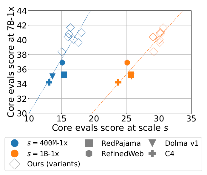 여기에서, x축은 400M, 1B 파라미터의 모델 성능이고 y축은 7B 모델의 성능을 나타낸다. 두 경우 모두 correlation 0.885와 0.919로 큰 상관 관계를 보인다. 이는 소규모 모델로 찾은 curation 전략은 대규모 모델로도 잘 이전된다는 점을 시사한다.