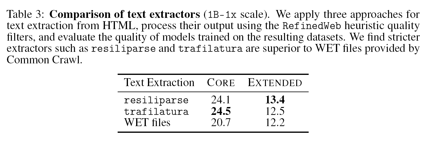 Text extraction은 raw HTML에서 텍스트를 추출해오는 단계이다. 이 단계의 효과를 이해하기 위해 1)resiliparse, 2) trafilatura, 3) WET 방법을 비교한다.