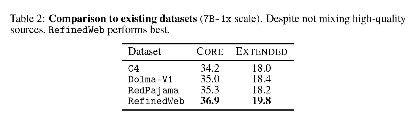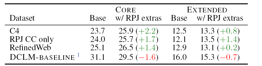 Table 2는 C4, Dolma-V1, RedPajama, RefinedWeb 데이터셋에 따른 CORE와 EXTENDED 점수를 나타낸다. 네 가지 데이터셋 모두 다양한 heuristic filters와 데이터 정제 작업을 거쳤지만, RefinedWeb이 가장 성능이 좋은 것을 보인다. 흥미롭게도, Dolma와 RedPajama는 Wikipedia와 같은 high-quality 데이터가 섞인 반면, RefinedWeb은 common-crawl에서 필터링 및 deduplication만 적용한 데이터셋이다. 이는 RefinedWeb이 상대적으로 강한 필터링 방법을 적용했음을 시사하고, DCLM-Baseline에서는 RefinedWeb의 필터링 방법을 차용한다.