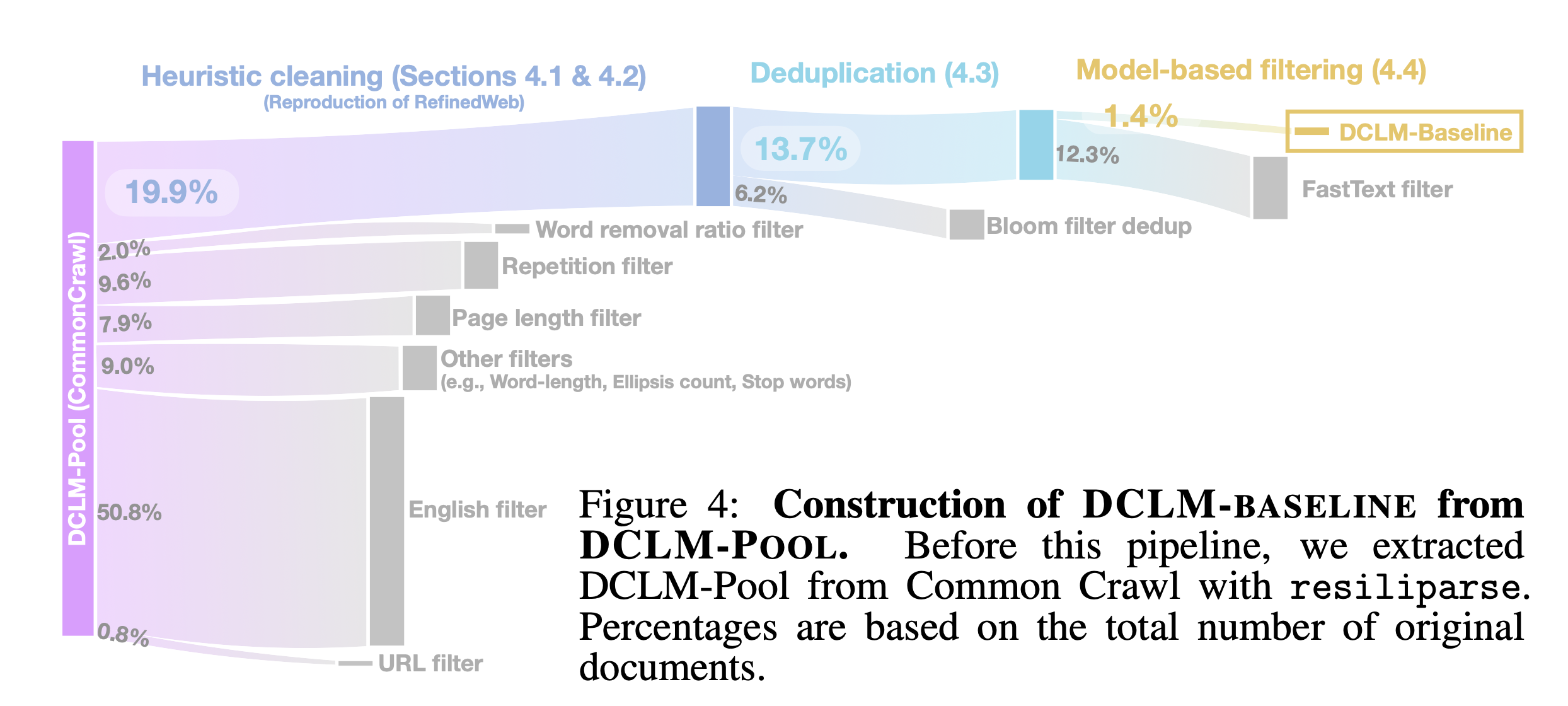 이를 위해 우선 common-crawl 기반의 240T token으로 구성된 코퍼스 DCLM-Pool을 소개한다. DCLM-Pool은 공개 코퍼스 중 가장 큰 규모로 DCLM filtering track의 기반이 된다.