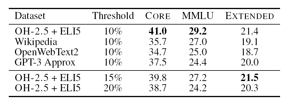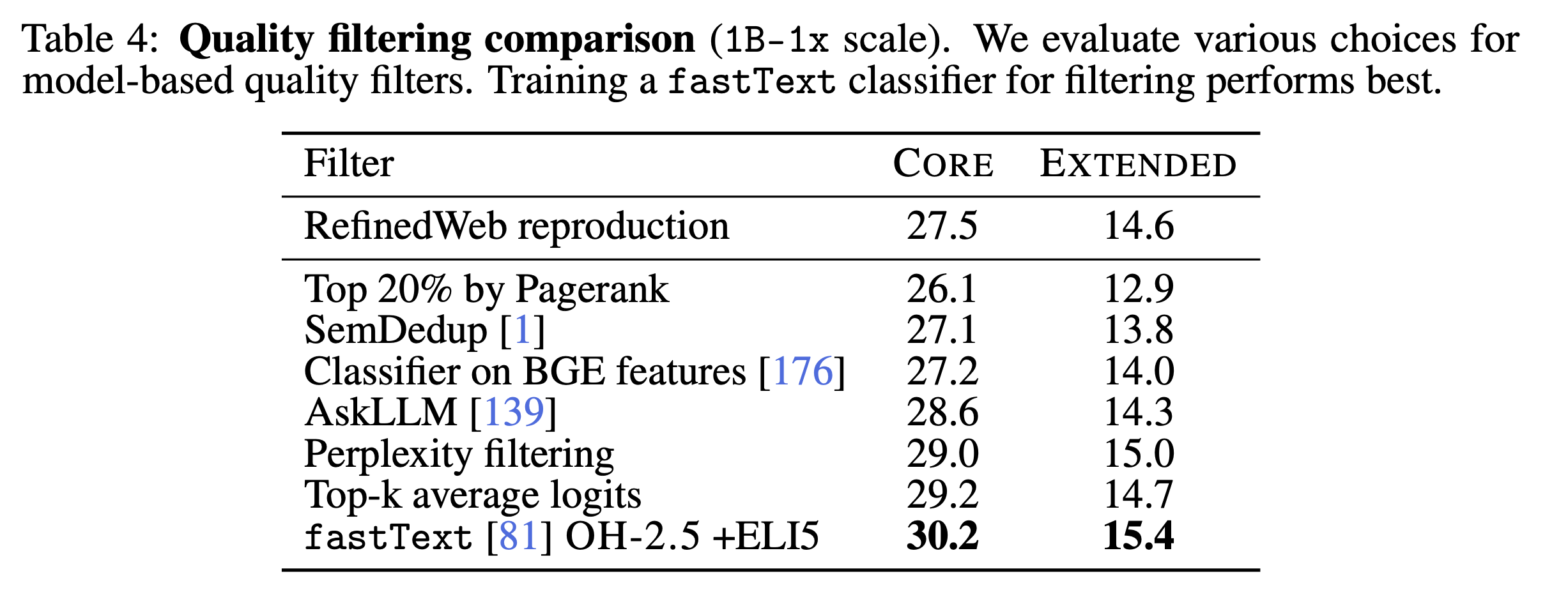 또한, fastText의 경우 Wikipedia, OpenWebText2, RedPajama-books 및 OpenHermes2.5(OH-2.5), ELI5(high-quality reddit QA data)를 조합하여 실험적으로 성능을 측정한다. 흥미로운 점은, OH-2.5와 ELI5를 조합하여 fastText 모델을 학습하여 필터링한 데이터가 LLM 학습에서 가장 좋은 성능을 보인다는 점이다. OH-2.5와 ELI5는 instruction-following 포맷으로 구성되어 있다는 점을 주목해야 한다.