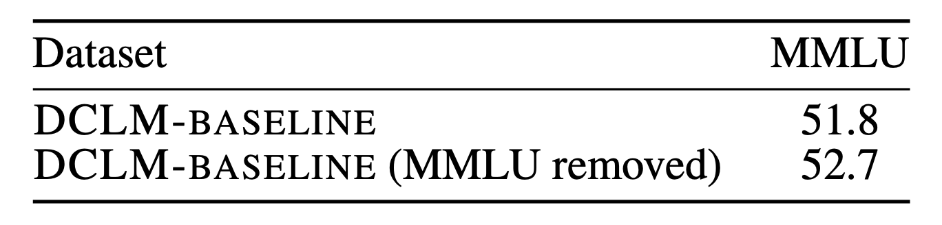 MMLU 기반으로 decontamination을 진행한다. MMLU의 마지막 문장(질문)과 선택지 중 하나를 포함하는 문서가 있다면, 질문 및 선택지와 일치하는 부분을 삭제한다. (재현율을 높이기 위해 마지막 문장만 선택)