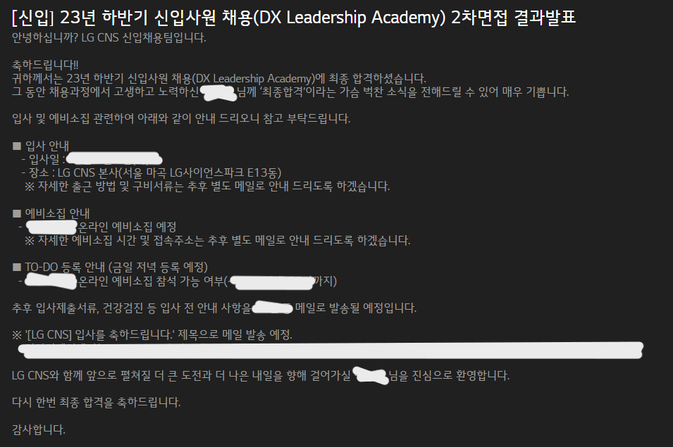 결과가 나오기까지 근4주가 걸렸다.정말 지옥같은 "오늘은 나오겠지?"를 2주가까이 했던거같다.6일 저녁즈음 유튜브를 보면서 백수생활을 이어나가던중 결과발표가 게시되었다고 문자가 날라왔다.순간 키득거리던 웃음기는 사라지고 숨이 가빠 왔다.최종합격을 보고나서야 숨이 쉬어지는 경험을 했다.