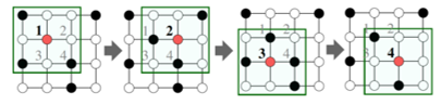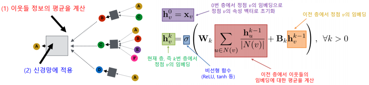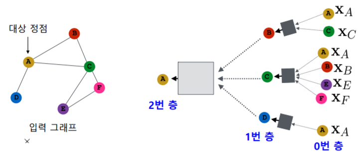 대상 정점의 임베딩을 얻기 위해 이웃들 그리고 이웃의 이웃들의 정보를 집계한다.