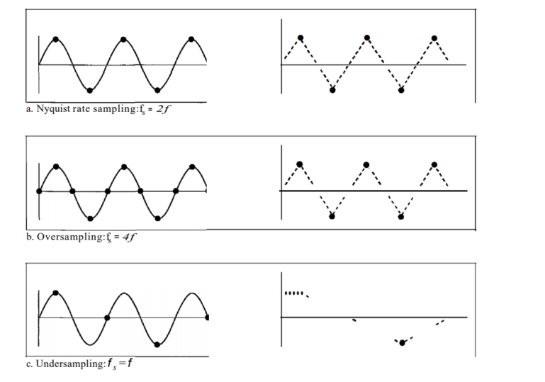 나이키스트 정리에 따르면, 원래의 아날로그 신호를 재현하기 위해 샘플링 rate가 원래의 신호에서 가장 높은 주파수의 2배 이상이 되어야 한다