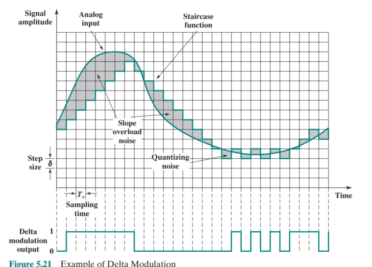 델타 변조를 사용하는 경우 아날로그 입력은 각 샘플링 간격(Ts)에서 하나의 양자화 수준(d)만큼 위 또는 아래로 이동하는 계단 함수에 의해 근사된다.