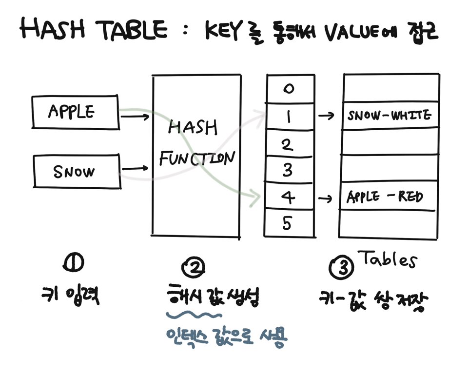 해시 함수에 입력4로 변환[4]에 키-값 Apple-Red 쌍을 저장삽입, 삭제, 검색 모두 평균적으로 O(1), 충돌이 많은 최악의 경우에는 O(n)