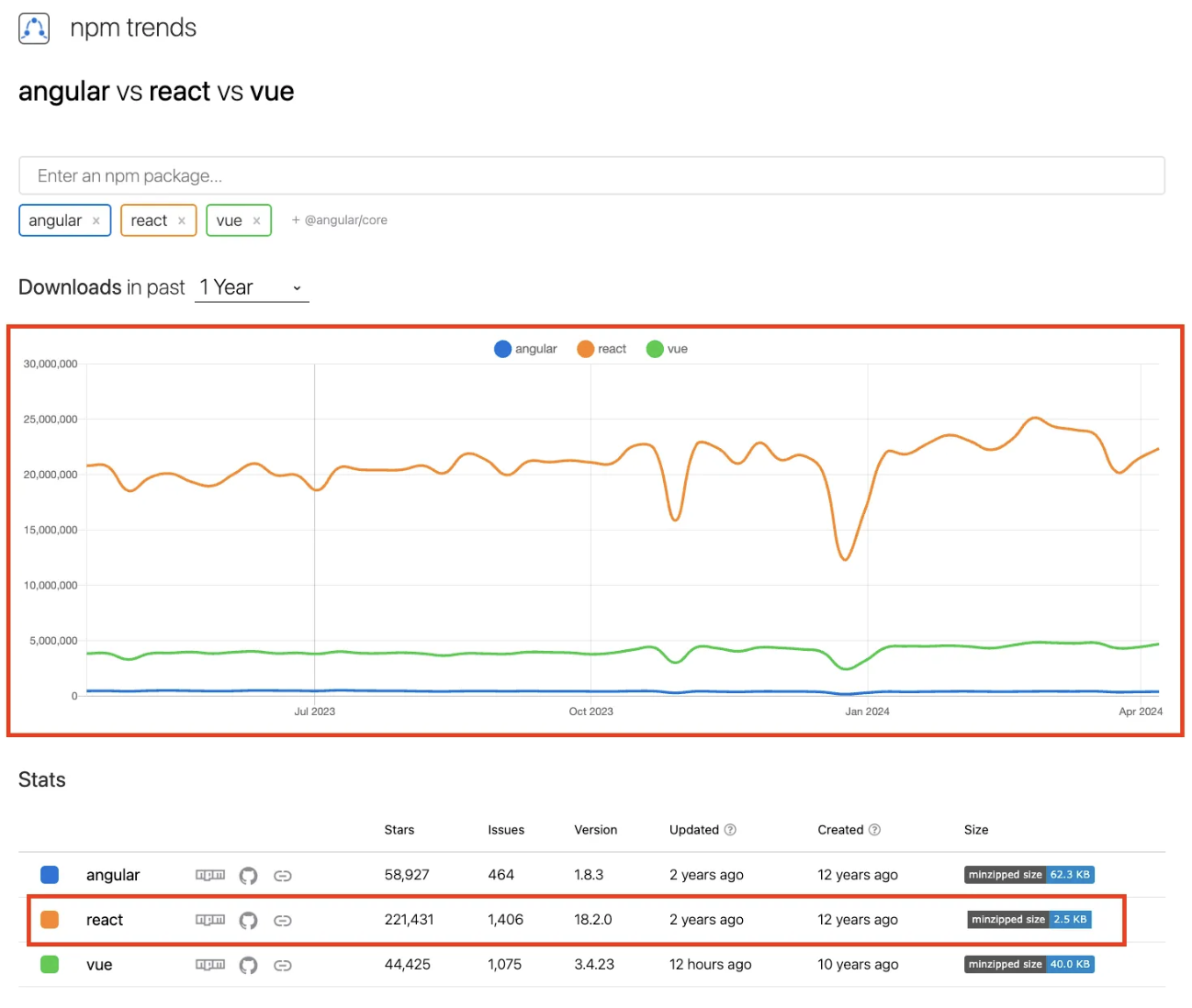 높은 인기: npm에 등록된 패키지의 다운로드 수를 의미하는 npm trends에서 SPA 아키텍쳐기술의 동향을 살펴보았을 때, react.js의 인기가 월등히 높은 것을 알 수 있다.