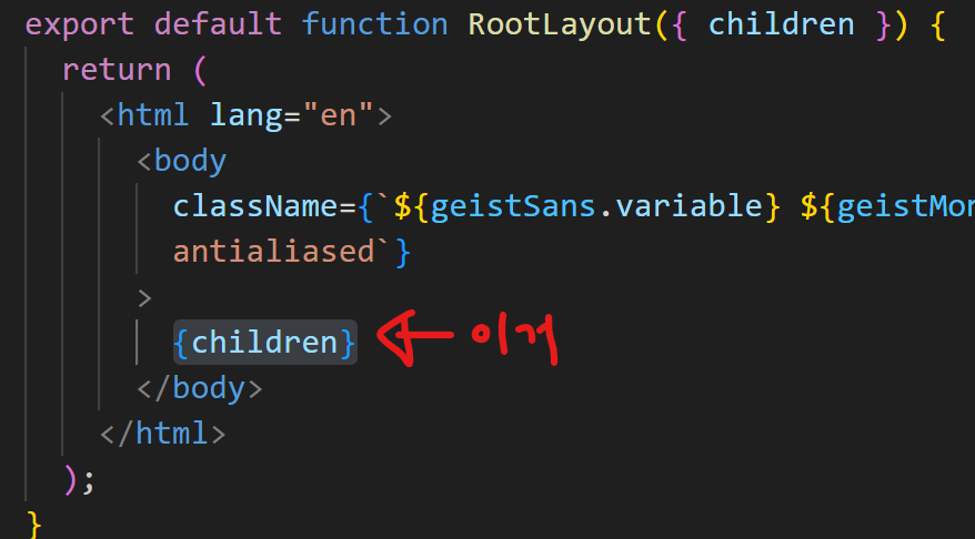 {children} 이라고 표기된 부분에 page.js 가 들어감