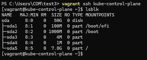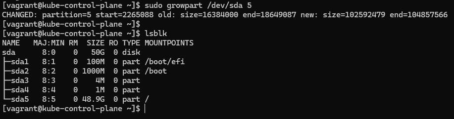 growpart 명령어를 통해 물리 파티션에 용량을 추가합니다. Root가 포함되어 있는 sda5 물리 파티션에 추가합니다.