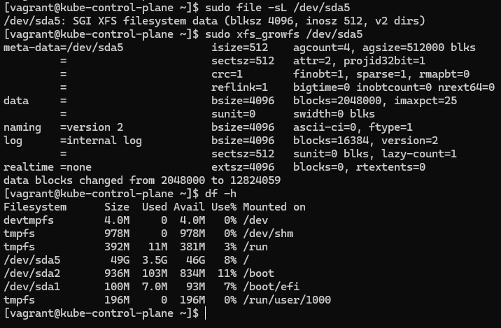 파일 시스템 유형 확인 => /dev/sda5에 마운트된 XFS 파일 시스템을 확장합니다. => 파티션 크기를 직접 조정하는 것이 아니라, 이미 할당된 공간을 모두 사용할 수 있도록 파일 시스템을 확장합니다.