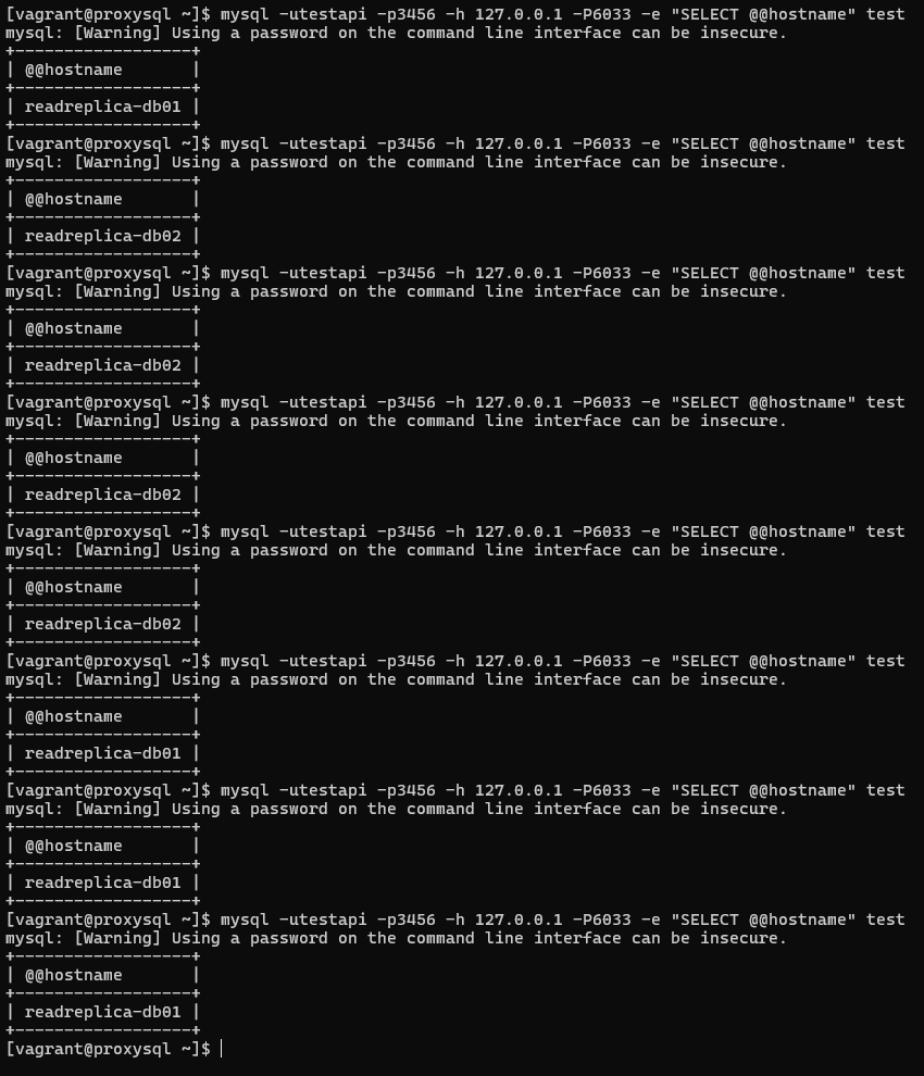 mysql -utestapi -p3456 -h 127.0.0.1 -P6033 -e "SELECT @@hostname" test