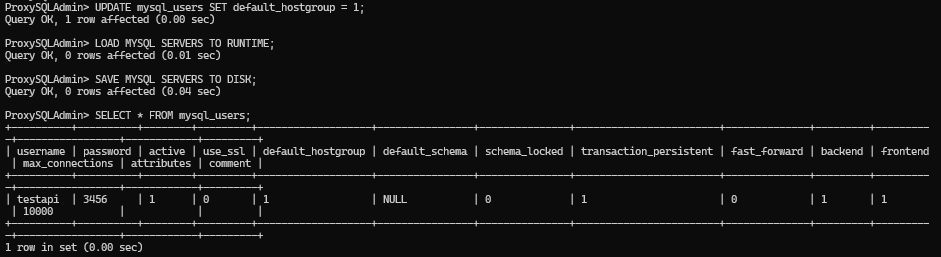ProxySQLAdmin> UPDATE mysql_users SET default_hostgroup = 1;