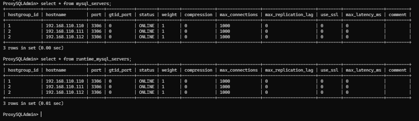 ProxySQLAdmin> LOAD MYSQL SERVERS TO RUNTIME;