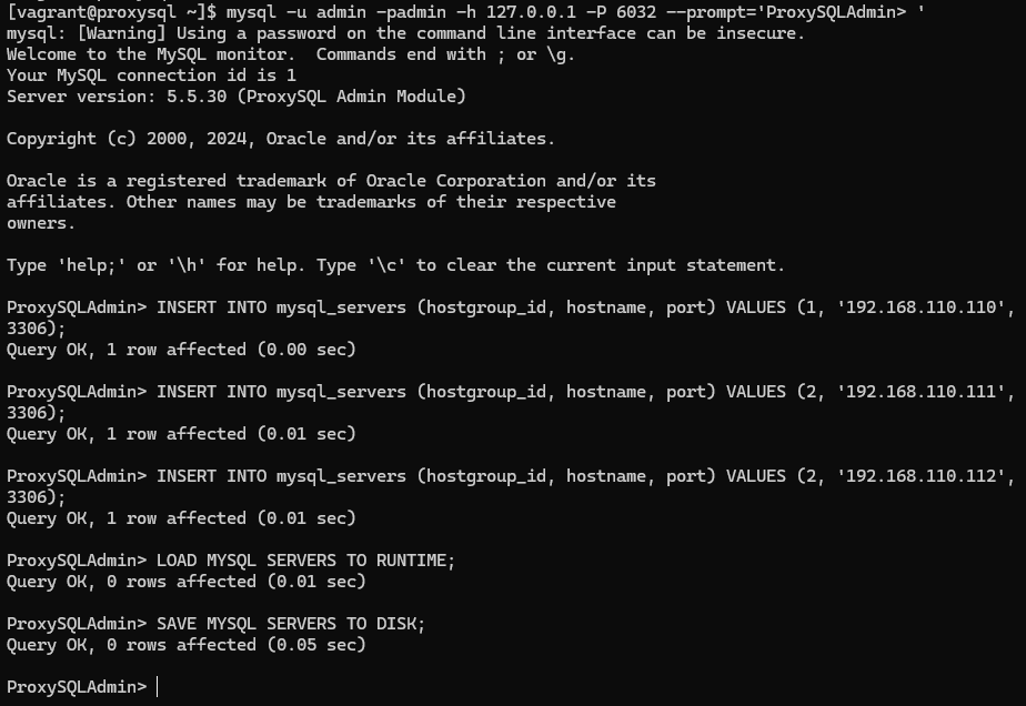 ProxySQLAdmin> INSERT INTO mysql_servers (hostgroup_id, hostname, port) VALUES (1, '192.168.110.110', 3306);