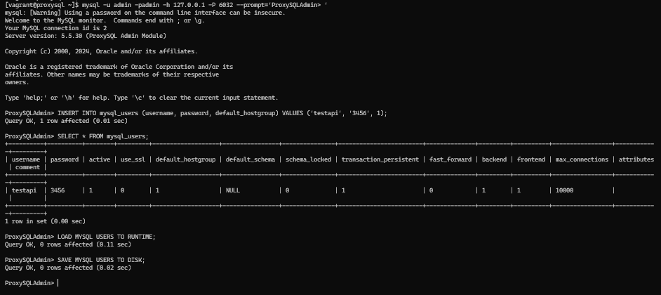 ProxySQLAdmin> INSERT INTO mysql_users (username, password, default_hostgroup) VALUES ('testapi', '3456', 1);