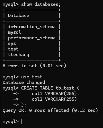 위에서 test 데이터베이스을 생성하지 않아서 DML 테스트가 불가능