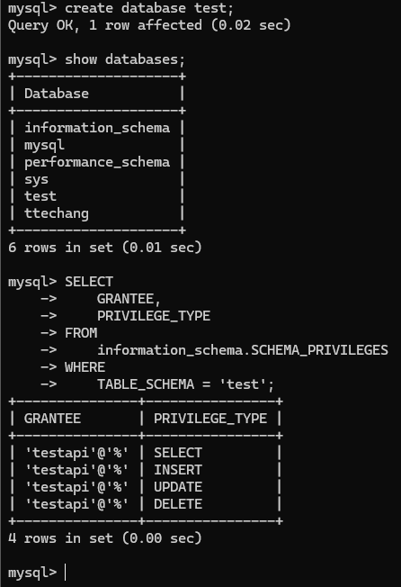 | GRANT SELECT, INSERT, UPDATE, DELETE ON `test`.* TO `testapi`@`%` |