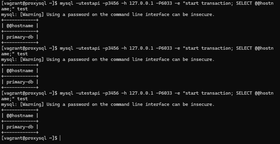 mysql -utestapi -p3456 -h 127.0.0.1 -P6033 -e "start transaction; SELECT @@hostname;" test