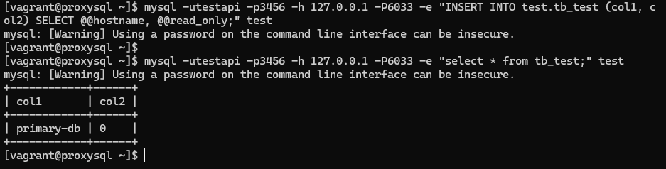 - mysql -utestapi -p3456 -h 127.0.0.1 -P6033 -e "INSERT INTO test.tb_test (col1, col2) SELECT @@hostname, @@read_only;" test