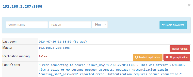 "Error connecting to source 'slave_db@192.168.110.111:3306'. This was attempt 1/86400, with a delay of 60 seconds between attempts. Message: Authentication plugin 'caching_sha2_password' reported error: Authentication requires secure connection."