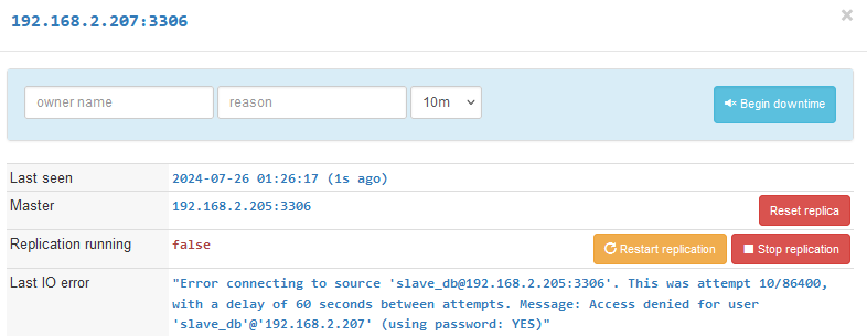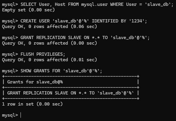 - 기존엔 master서버에서 'slave_db'사용자 생성시 slave서버에도 'slave_db'사용자가 생성되어 접근할 수 있었지만 master가 중지되어 새로 master로 승격된 replicadb1에는 'slave_db' 사용자가 없습니다.