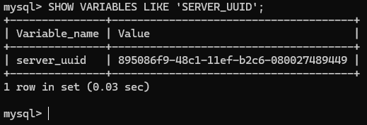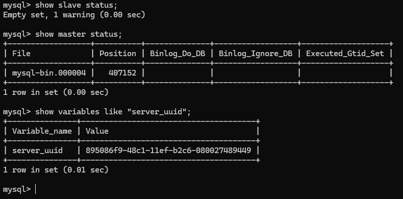 master서버에서 server_uuid값을 조회하고 slave서버에서 Master_UUID값이 일치하는지 확인합니다.