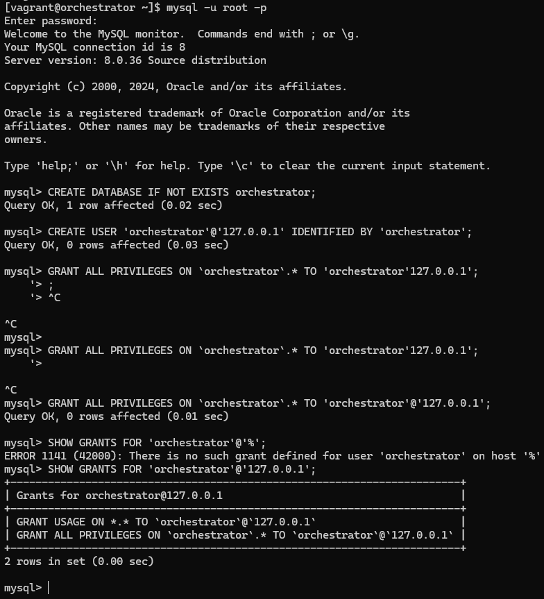GRANT ALL PRIVILEGES ON `orchestrator`.* TO 'orchestrator'127.0.0.1';